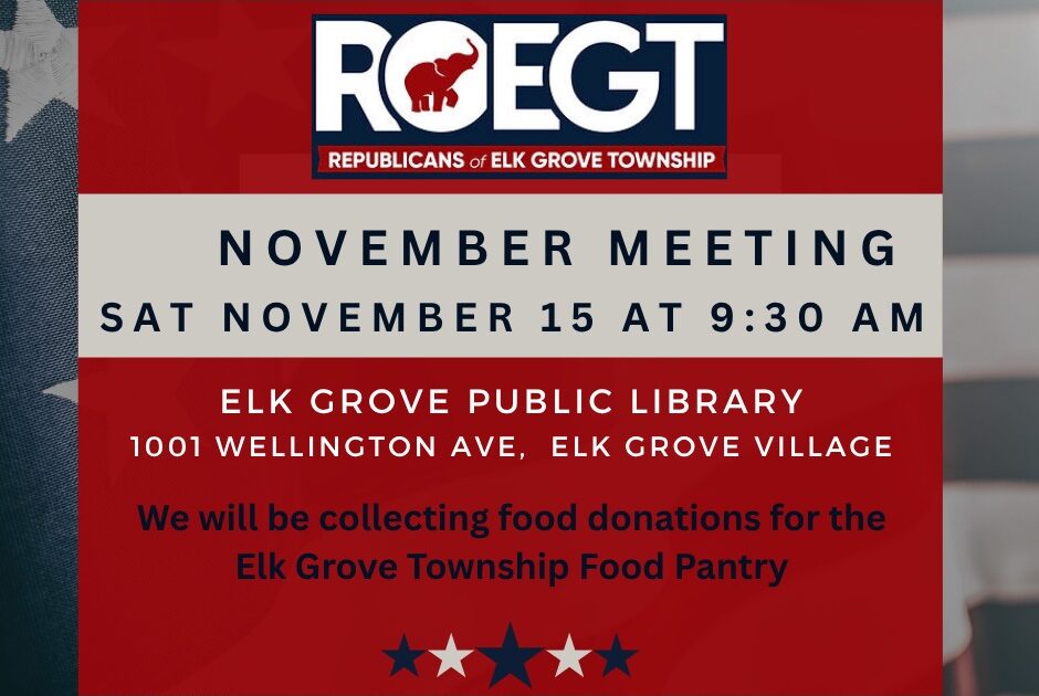 The November meeting of the Republicans of Elk Grove Township will take place on Saturday at the Elk Grove Public Library. Candidates for office will speak and the group is collecting food donations for the Elk Grove Township Food Pantry! The pantry is in particular need of the following items…jams & jellies, SpaghettiOs & Chef Boyardee, Baking mixes, Sugar, Condiments & Dressings, Pickles & Olives, Personal Hygiene Items, and Baby items!